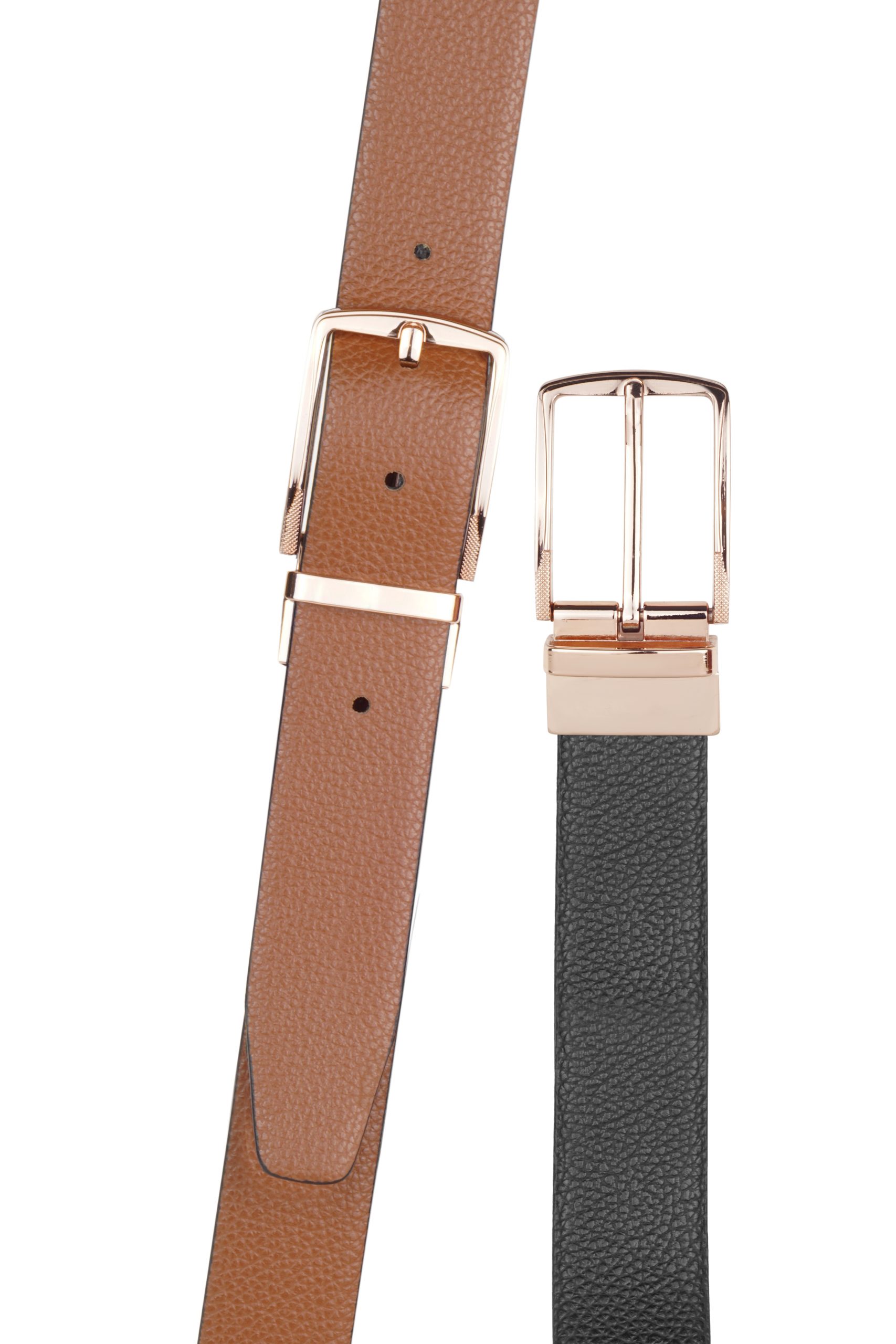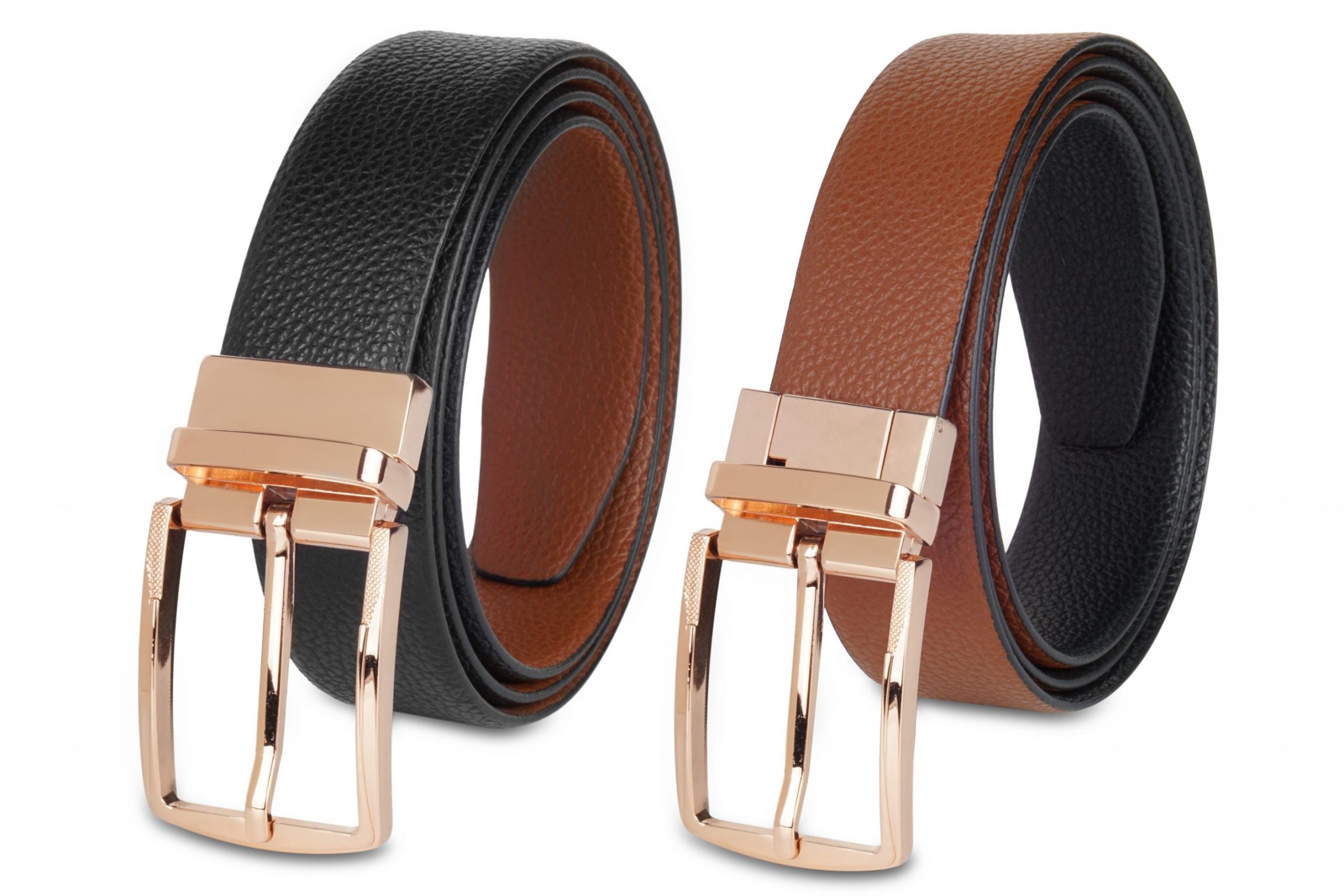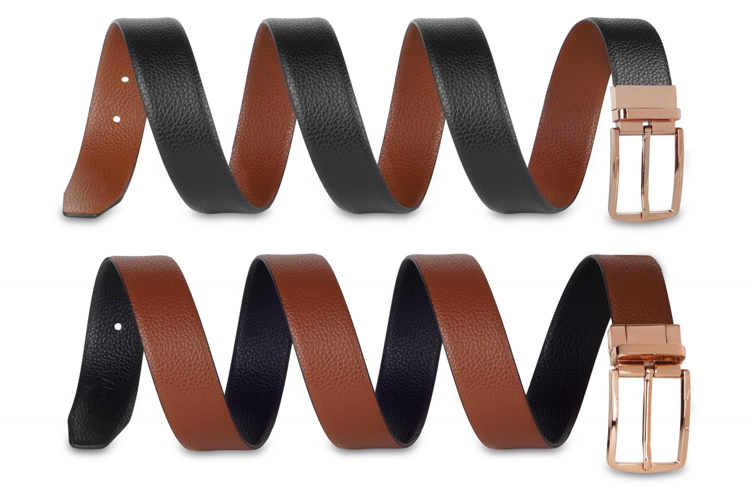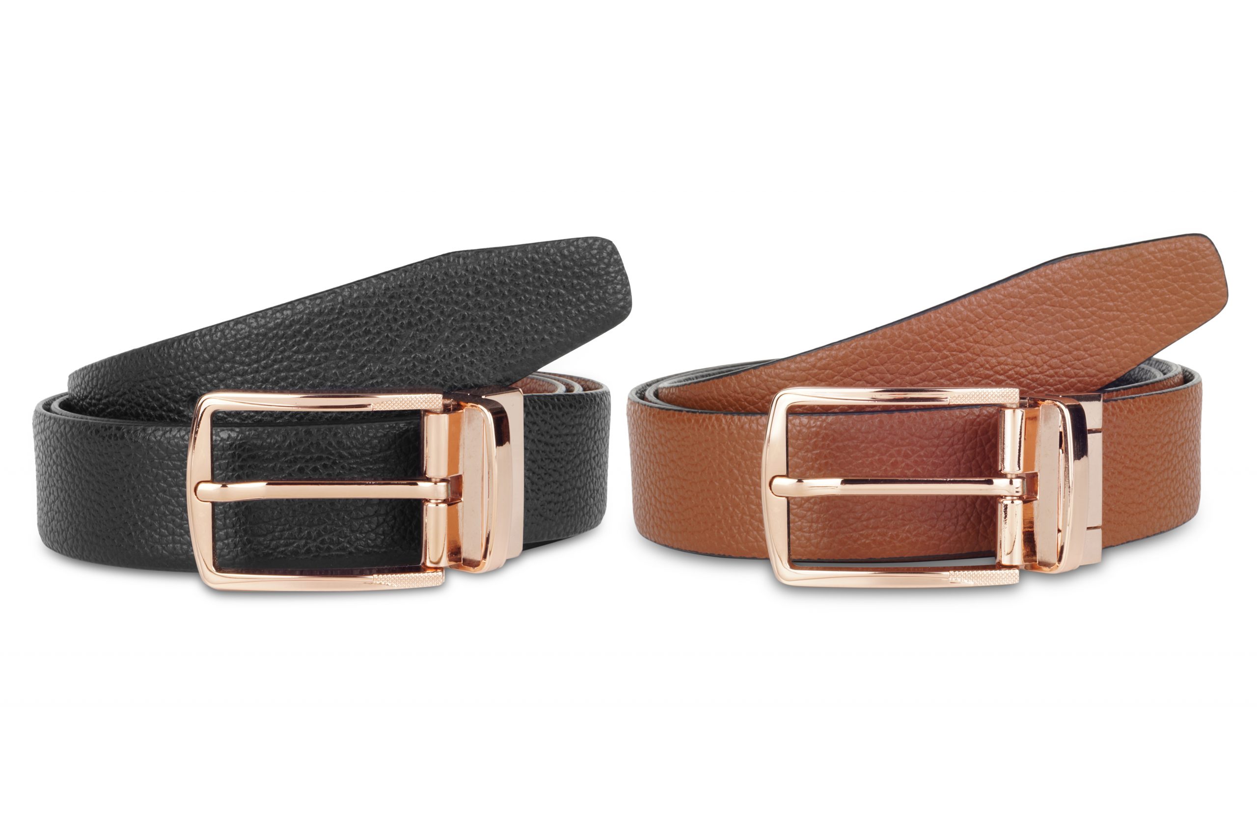 Super Quality Genuine Italian Leather Double sided belts. One side is Tan  and other side Black in colour. Its naturally textured belt, with no prints on it. Width of the belt is 35mm. Total length of the belt is 6 inches more than the belt size, so that it is easy to adjust the belt to the waist. The belt is attached with imported high quality designer rich Rose Gold  buckle. This buckle is very sturdy, anti-rust and very easy to use. To reverse just pull and twist buckle. The belt looks super smart with special occasion clothes. is perfect to match any of your formal wears. The turning buckle makes it easy to use both sides without any effort. The design of the buckle may vary slightly. Perfect choice to buy one for yourself to flaunt your style.